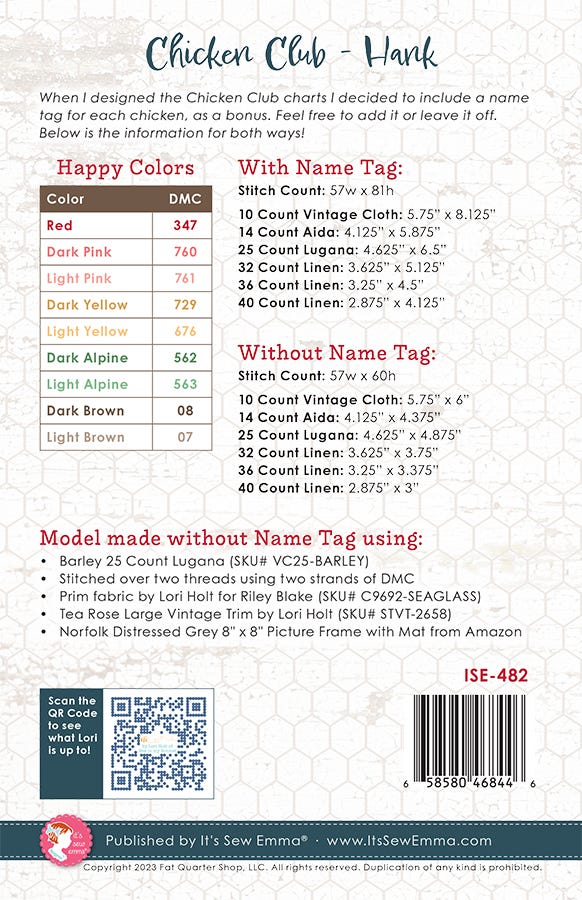Introducing the Hank Chicken Club #5 Cross Stitch Pattern by Lori Holt of Bee in My Bonnet for It’s Sew Emma. This charming farmyard-inspired design is part of Lori’s beloved Chicken Club Series, perfect for stitchers who adore whimsical, vintage-style patterns. The chart is printed in full color on durable 8.5” x 11” cardstock and includes easy-to-follow instructions, diagrams, and a complete supply list with suggested DMC floss colors.