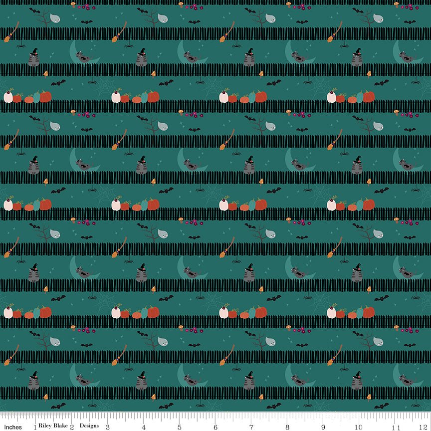 Introducing the Little Witch Sitting on a Gate Teal by Jennifer Long of Sew A Story for Riley Blake Designs – a whimsical and enchanting fabric perfect for quilting, apparel, and home decor. This delightful striped print features a charming picket fence adorned with pumpkins, bats, mushrooms, ghosts, and more, adding a touch of magical charm to any project.