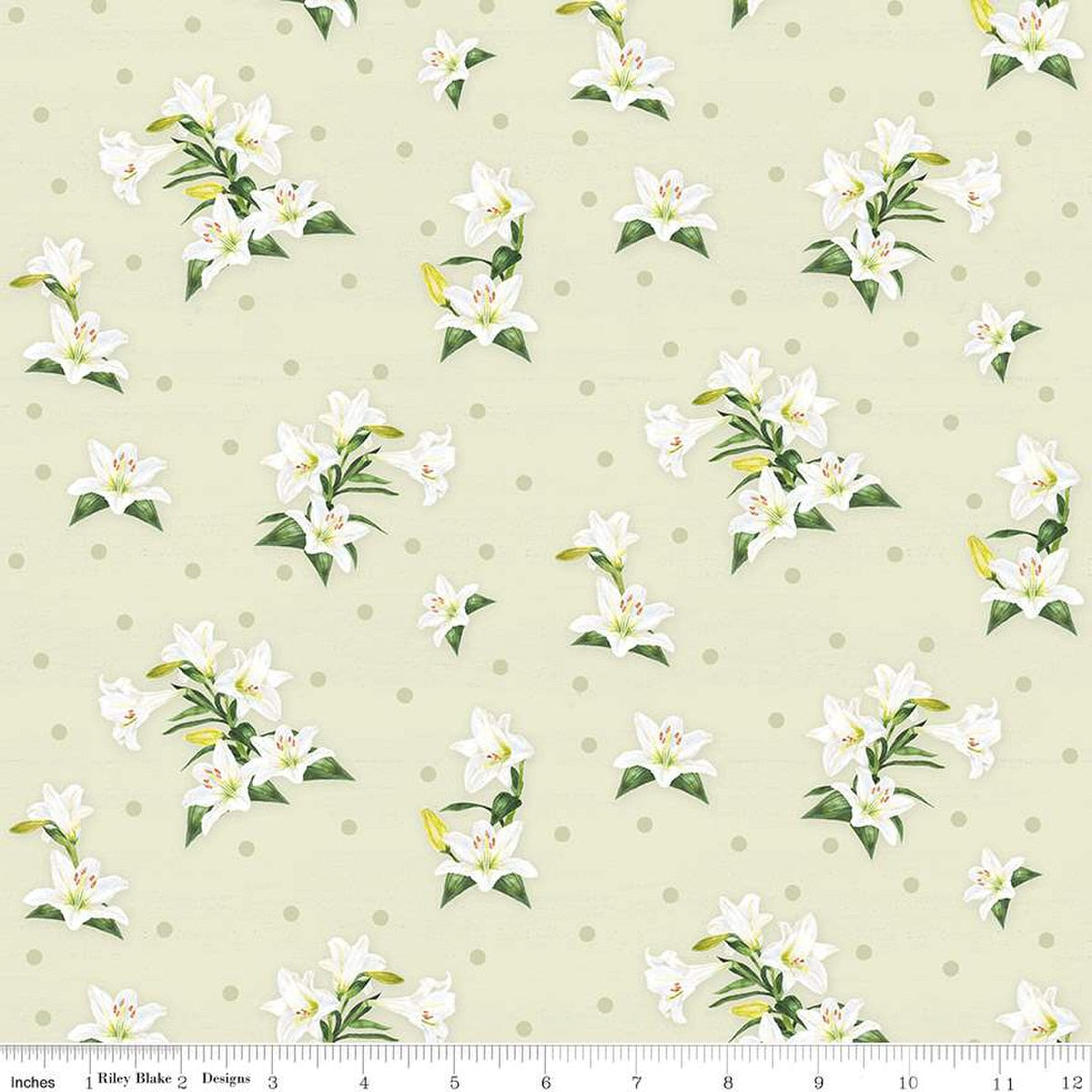 A soft pearl-colored yardage with a gentle lily toss design. Provides a subtle, elegant backdrop or border for the April Panel and other sophisticated spring projects.