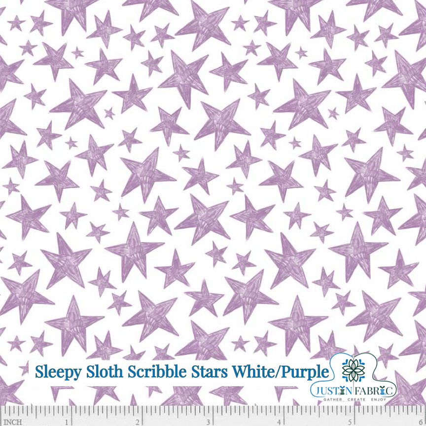 Sleepy Sloth Scribble Stars White/Purple Cotton Yardage by Debbie Monson| P&B Textiles