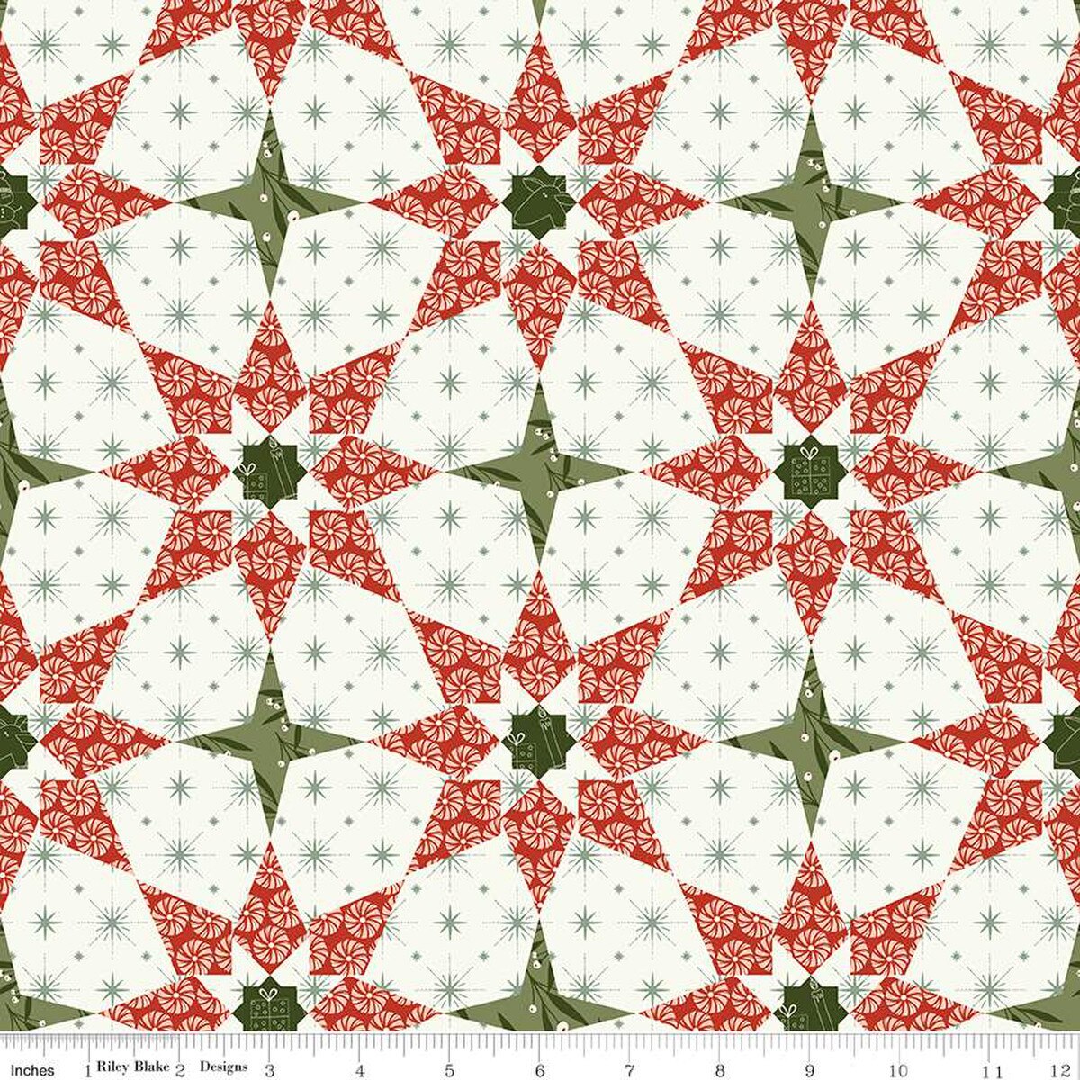 Celebrate the season with the Christmas Is In Town Christmas Stars Cream Cheater Print Yardage by Sandy Gervais for Riley Blake Designs. This festive fabric is designed to make quilting quick, fun, and magical. Featuring a charming cheater print of patchwork star blocks set against a soft cream background, it gives you the look of pieced stars without the extra sewing. Whether used on its own, as a quilt backing, or as part of a holiday project, this fabric brings instant Christmas cheer and handmade warmth.