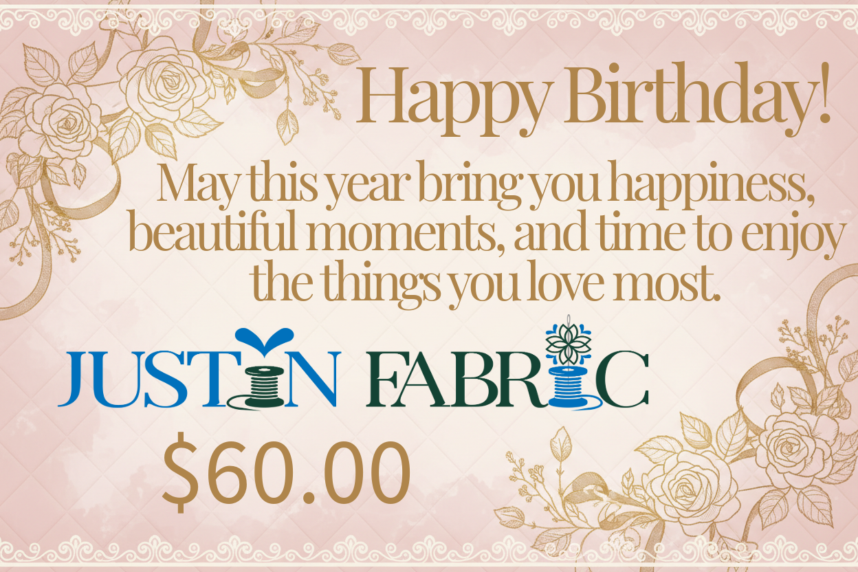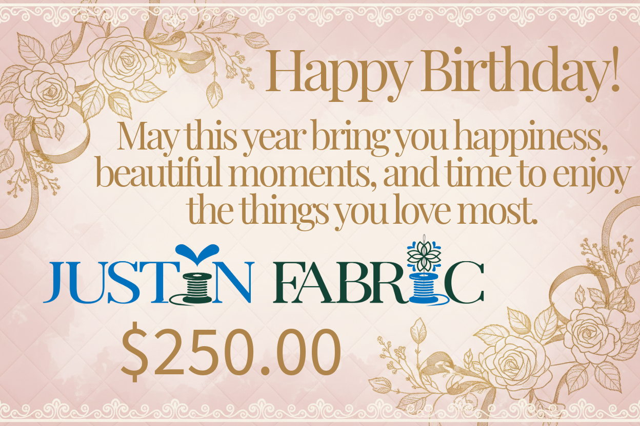 Celebrate their special day with the perfect gift for quilters and fabric lovers! Our Justin Fabric Birthday E-Gift Card lets them choose from our premium collection of quilting fabrics, patterns, and notions.