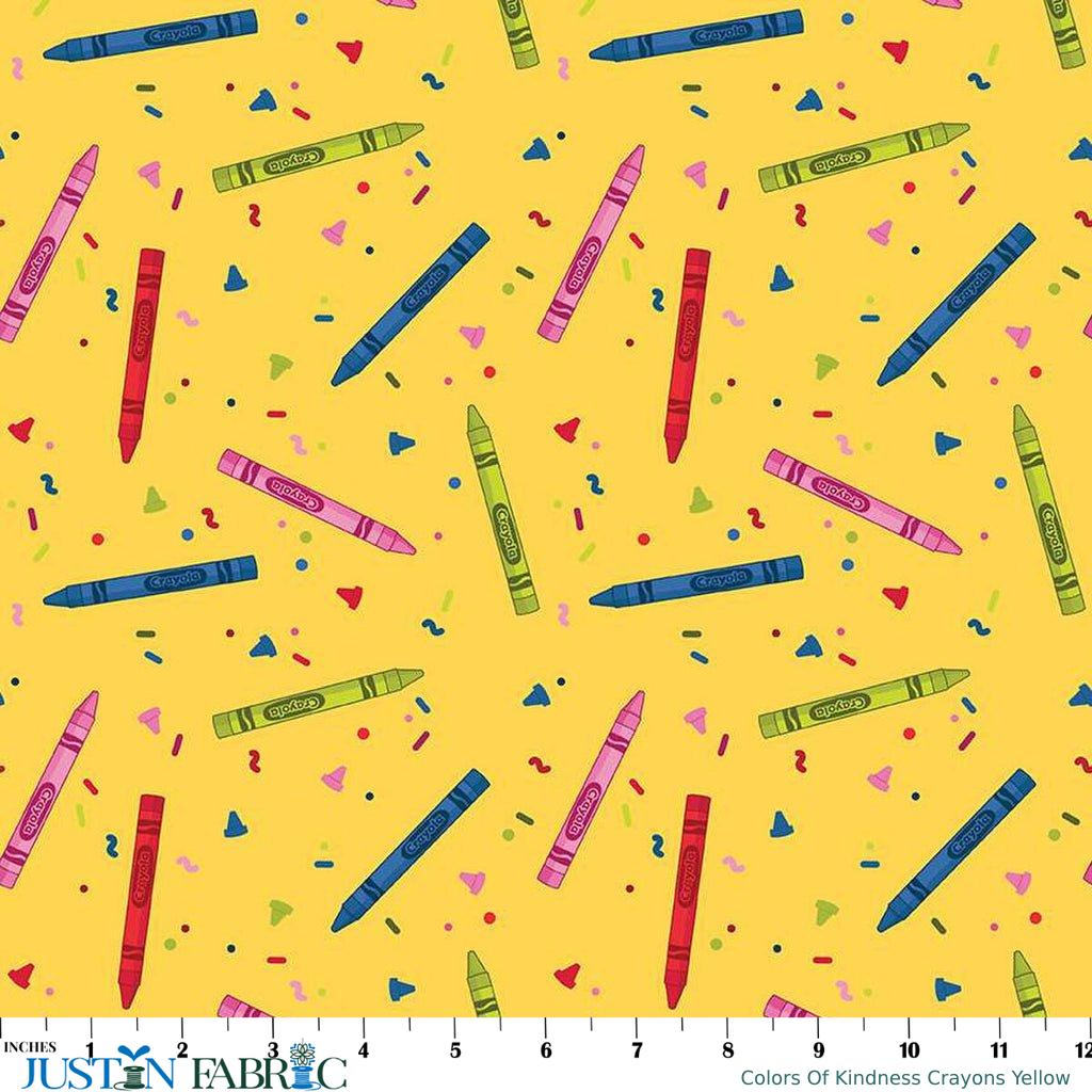 Introducing Colors Of Kindness Crayons Yellow Yardage | Riley Blake Designs by Riley Blake Designs. Colors of Kindness Crayons Navy by Riley Blake Designs features scattered Crayola Crayons with scattered dashes, dots, and squiggles on a yellow background. Designer: Riley Blake Official Licensed Product Brand: Riley Blake Designs Width: 43/44" Content: 100% quality quilt weight cotton