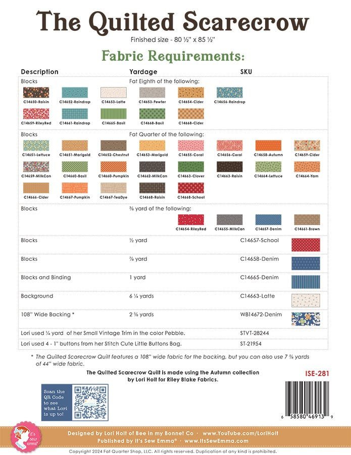 Discover the enchanting “Quilted Scarecrow Quilt” pattern, meticulously crafted by Lori Holt of Bee in my Bonnet for It’s Sew Emma. This delightful quilt features a pieced scarecrow, rake, milk can, pumpkin, and bird, all artfully surrounded by intricately designed leaves. Once completed, this masterpiece measures an impressive 80 1/2” x 85 1/2”. Immerse yourself in the spirit of autumn and be one of the first to bring this heartwarming creation to life upon its release in April 2024.
