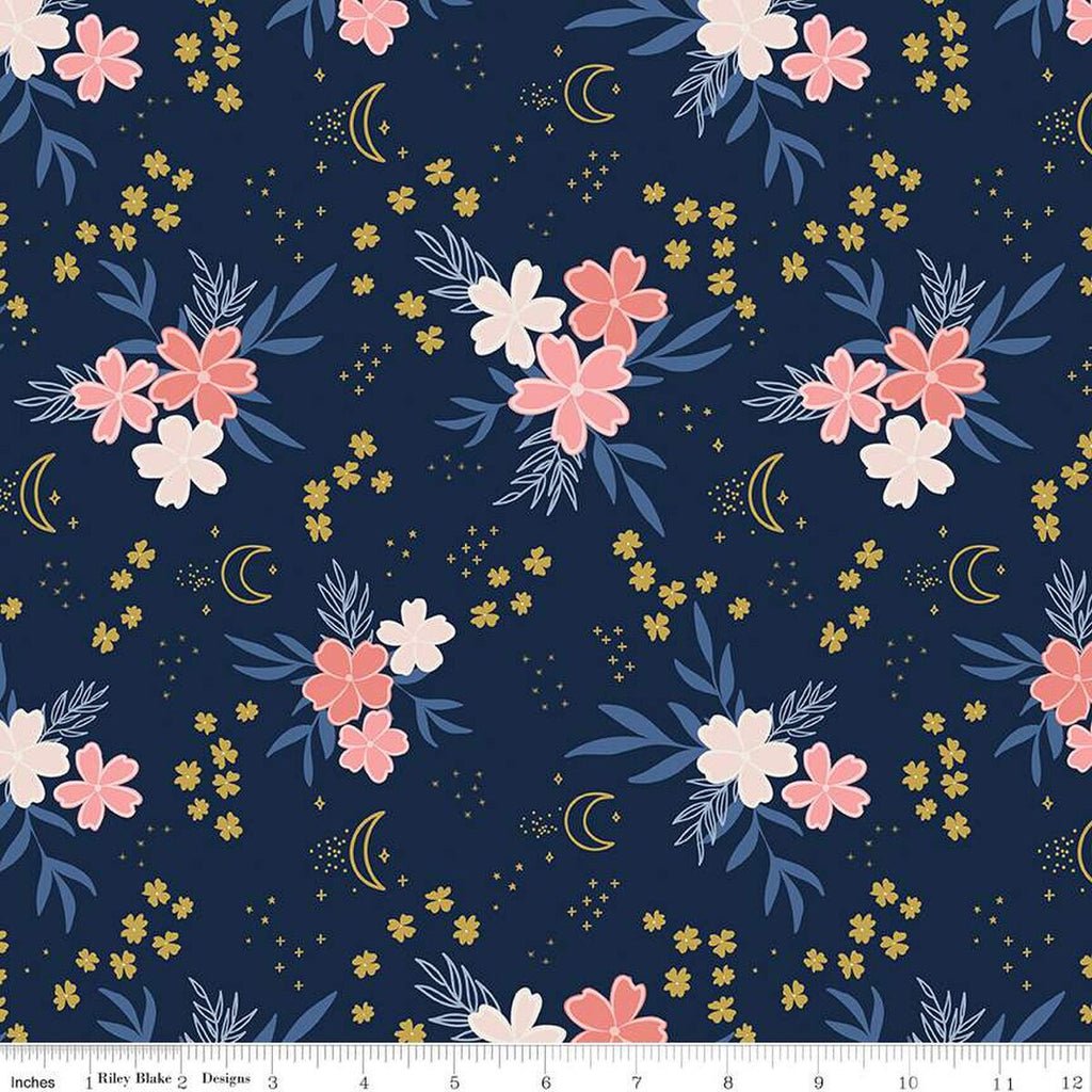 Moonchild by Fran Gulick of Cotton and Joy for Riley Blake Designs is great for quilting, apparel and home decor. This print features flowers, moons, cross and asterisk stars, and dots. Gold is gold sparkle.