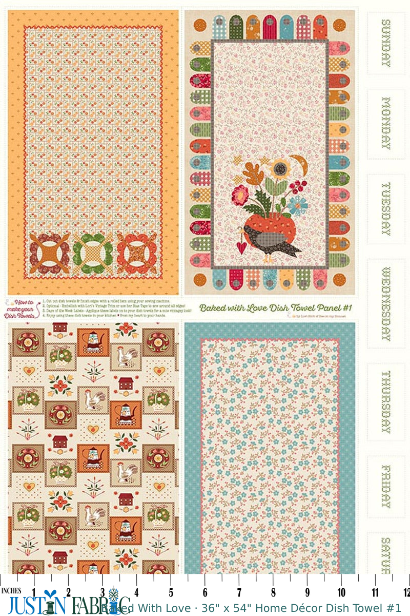 Introducing the Baked With Love 36" x 54" Home Décor Dish Towel Panel #1 by Lori Holt, brought to you by Riley Blake Designs. This charming fabric panel is designed with love by acclaimed designer Lori Holt and is perfect for quilters and crafters looking to add a personal touch to their kitchen décor. Crafted from 100% quilt cotton, it offers a soft yet durable texture, ideal for a variety of sewing and quilting projects.
