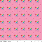 • Pattern: Rows of Hearts and Rainbow Colored Sewing Machines on Hot Pink Background