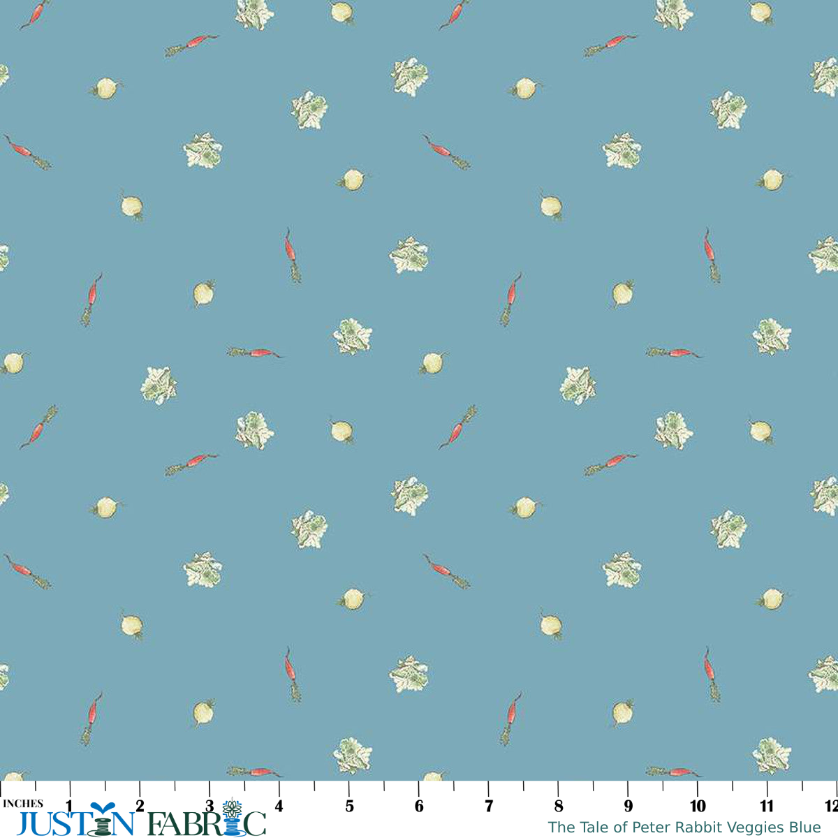 Introducing the Tale Of Peter Rabbit Veggies Blue Yardage by Beatrix Potter for Riley Blake Designs – a delightful fabric that captures the charm of Peter Rabbit and his adventures in the vegetable garden. This collection is perfect for quilting, apparel, and home decor, featuring scattered vegetables that add a touch of whimsy to any project. This is an official licensed product of BEATRIX POTTER™. © Frederick Warne & Co., 2023. All Rights Reserved.